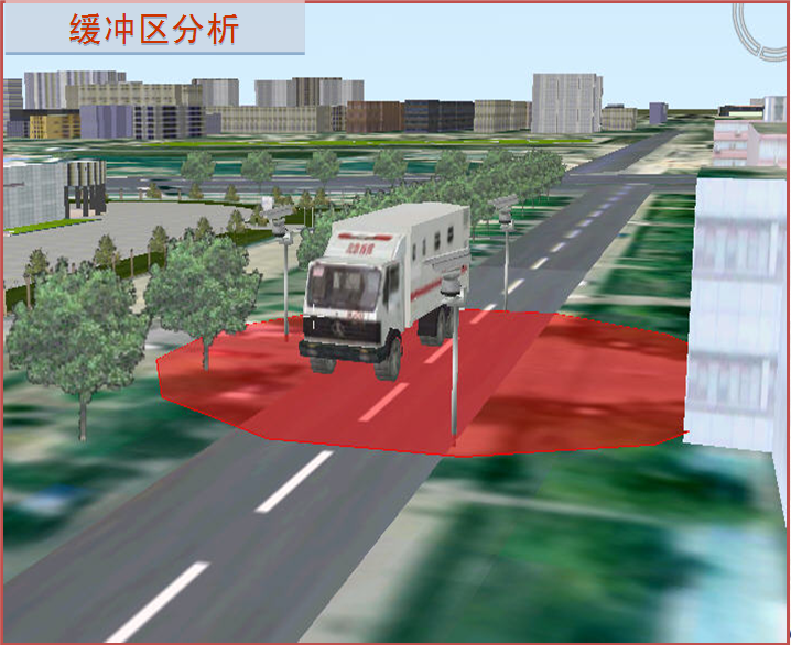 系統(tǒng)是基于三維地理信息系統(tǒng)的,所以可以提供多種高級(jí)分析工具。對(duì)于危險(xiǎn)品運(yùn)輸車(chē)輛,當(dāng)其駛?cè)氤鞘蟹秶鷥?nèi),則進(jìn)入一級(jí)警備狀態(tài)。首先對(duì)車(chē)載危險(xiǎn)源(車(chē)輛運(yùn)輸?shù)奈矬w:如氣體、液體等)進(jìn)行獲取,采用緩沖區(qū)分析方法,建立擴(kuò)散模型;根據(jù)危險(xiǎn)品的性質(zhì)及汽車(chē)行駛的路線(xiàn),當(dāng)車(chē)輛到達(dá)事故高發(fā)區(qū)時(shí),進(jìn)行提醒;對(duì)可能的事故災(zāi)害做到提前預(yù)警。一旦出現(xiàn)事故,可以迅速安排相關(guān)人員救援、指揮現(xiàn)場(chǎng)群眾有序疏散等,采取有效措施,積極應(yīng)對(duì)。